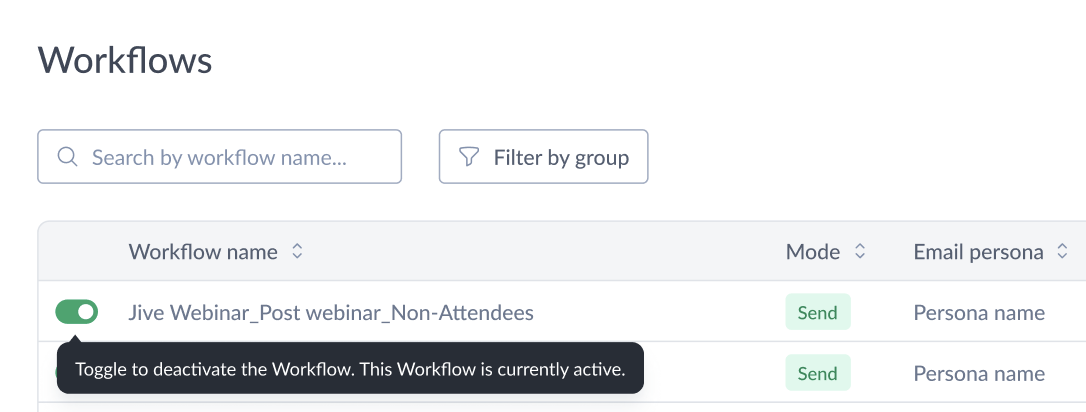 - Clicking the toggle button will turn the workflow on or off.