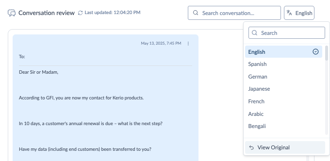 | Language list | Select the language you want to read in. | The conversation refreshes with a machine translation overlay. |