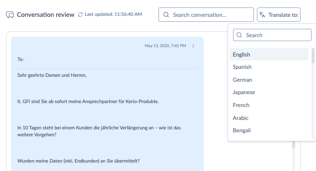 | Are my outgoing drafts automatically translated for me? | No. You can manually write in the desired language or use AI Generate to create a translated draft. |